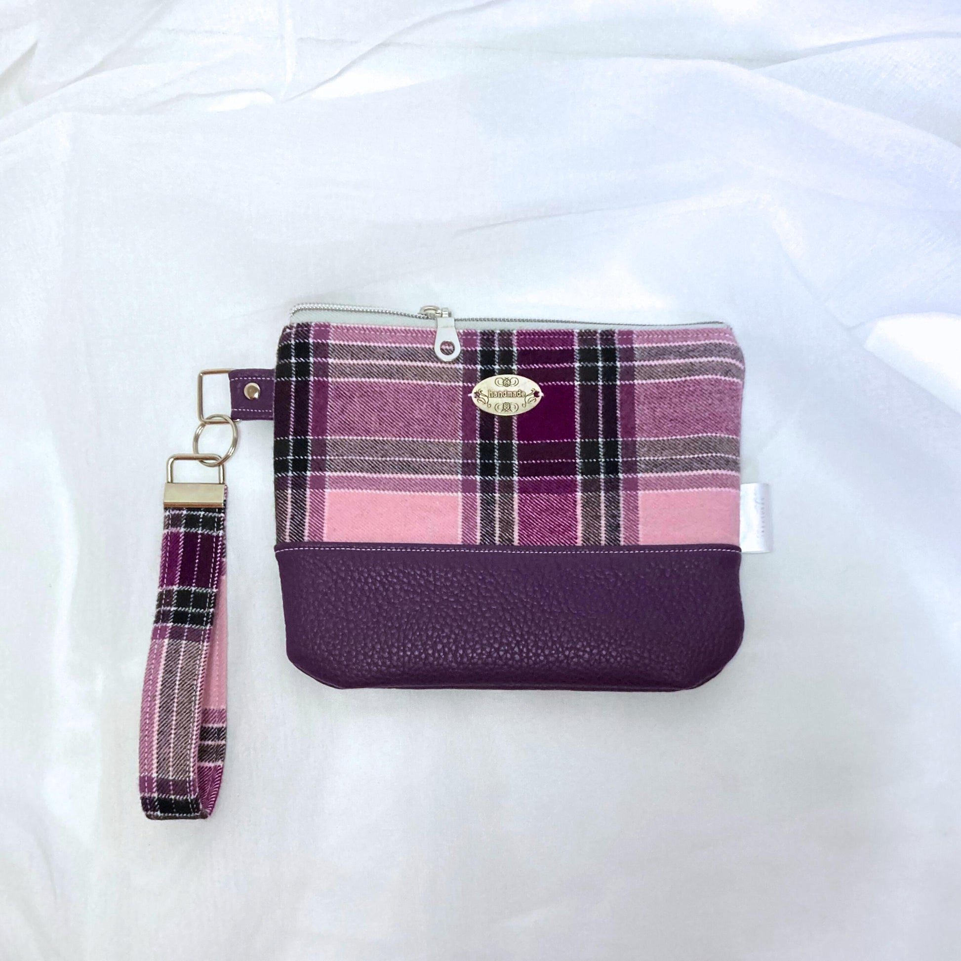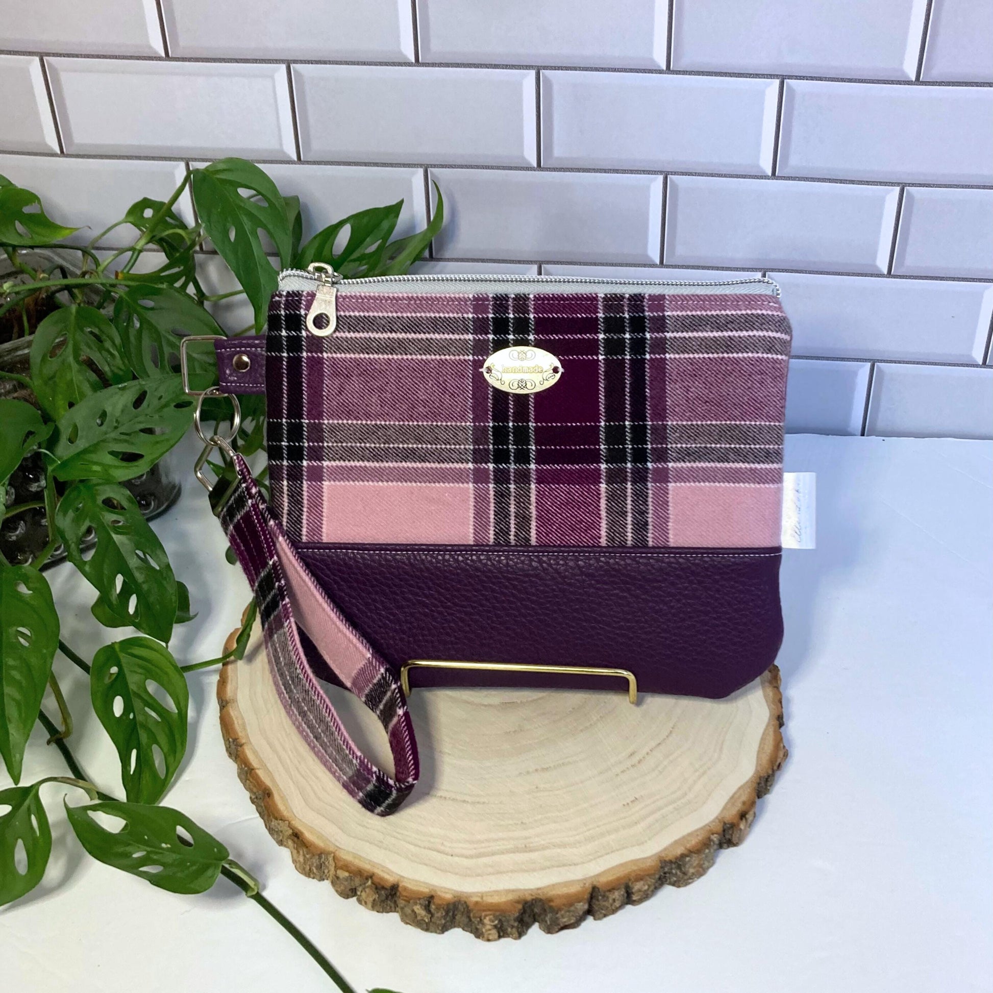 Plaid Wool Wristlet Purse | Tweed Woven | Purple Vegan Leather Vinyl Wristlet | Grab n Go Clutch Bag